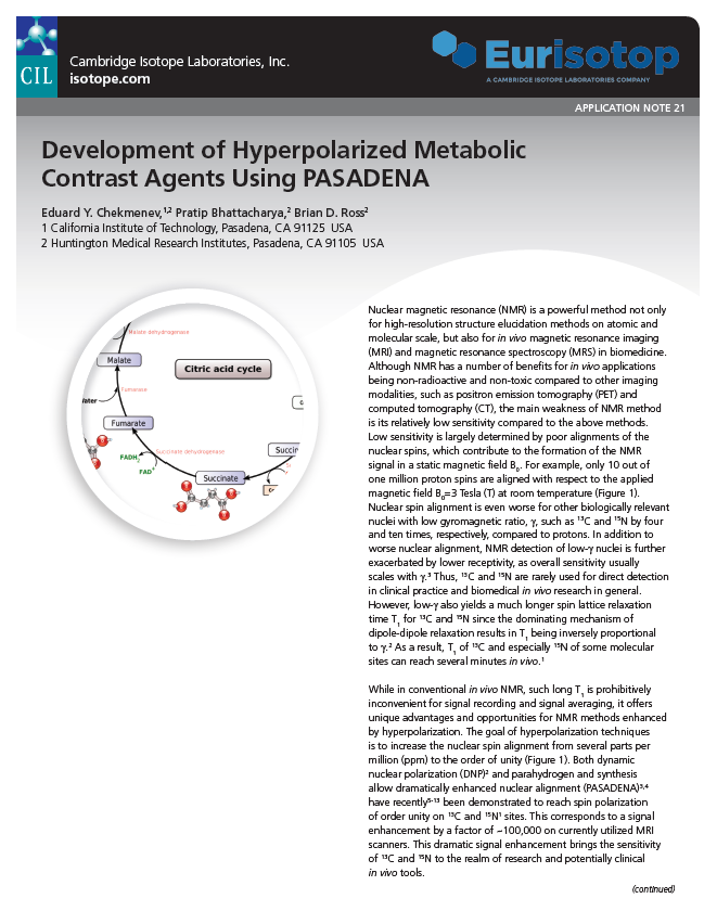 Development of Hyperpolarized Metabolic Contrast Agents Using PASADENA Document category: Metabolic ResearchDocument type: Application NoteDocument Thumbnail: Document file: development_of_hyperpolarized_metabolic_contrast_agents_using_pasadena.pdf