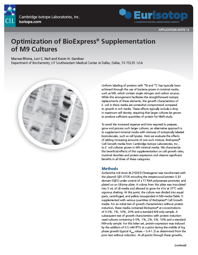 Optimization of BioExpress® Supplementation of M9 Cultures Document category: Biomolecular NMRDocument type: Application NoteDocument Thumbnail: Document file: optimization_of_bioexpressr_supplementation_of_m9_cultures.pdf